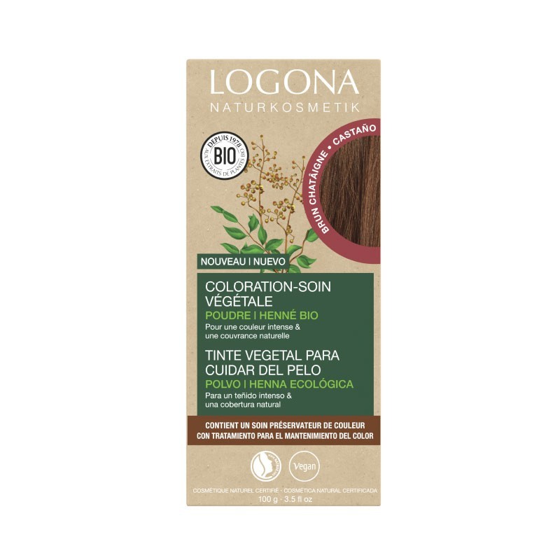 Colorante vegetal castaño marrón Logona Color vegetal intenso y duradero para cabello castaño claro a oscuro. Cubre las canas y realza el color natural con reflejos brillantes, sin dañar ni modificar la estructura del cabello. Aporta volumen y luminosidad gracias a su fórmula 100 % vegetal. Incluye gorro protector, guantes e instrucciones. Apto para veganos.