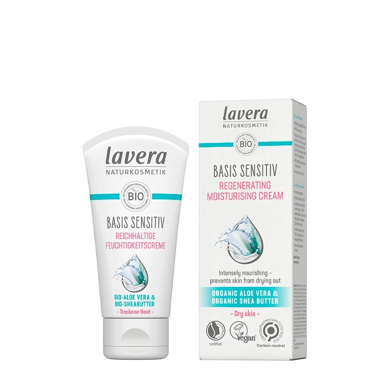 Crema de día hidratante basis sensitive piel seca lavera. Nutrición intensiva y duradera para el rostro. Esta crema facial hidrata, protege y suaviza la piel seca, ayudando a reforzar la barrera cutánea. Textura agradable, rápida absorción y alta tolerancia.