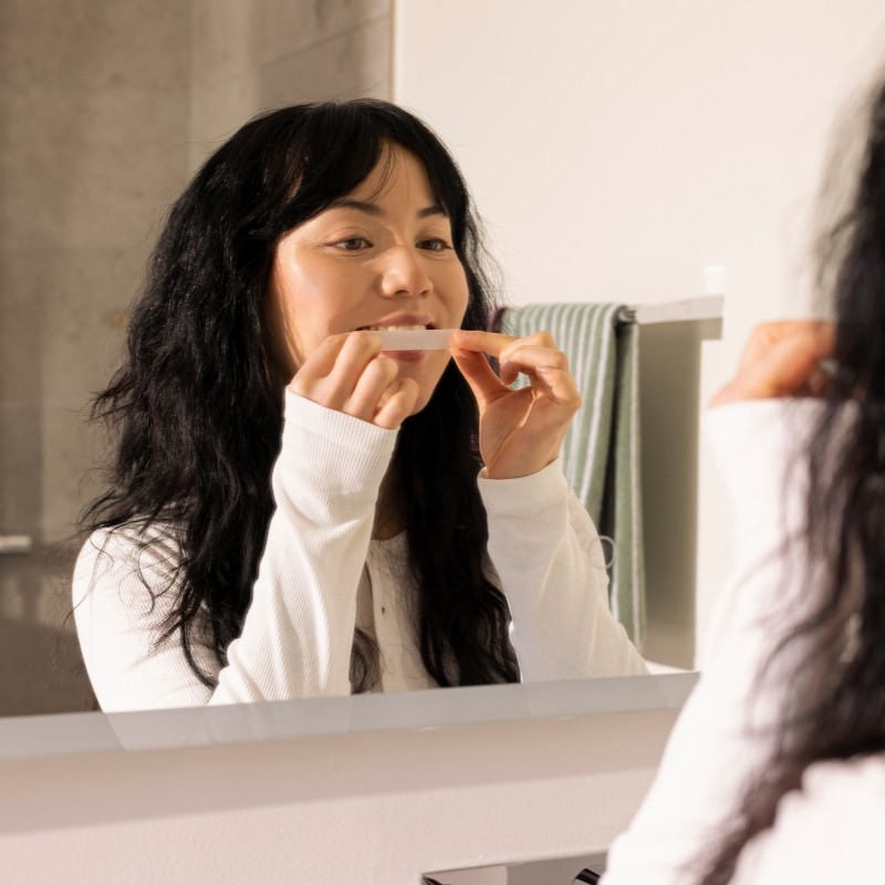 - Dobla el exceso de la tira por detrás de los dientes y presiona durante 2-3 segundos.