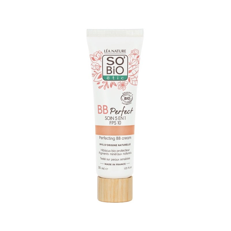 BB cream perfeccionadora 5 en 1 SPF 10 20 light SO’BiO étic. Crema con color 5 en 1 que hidrata, unifica, suaviza, ilumina y protege la piel. Su textura ligera aporta un acabado fresco y natural con protección solar SPF10. Ideal para un maquillaje rápido y saludable en todo tipo de piel, incluso sensible.