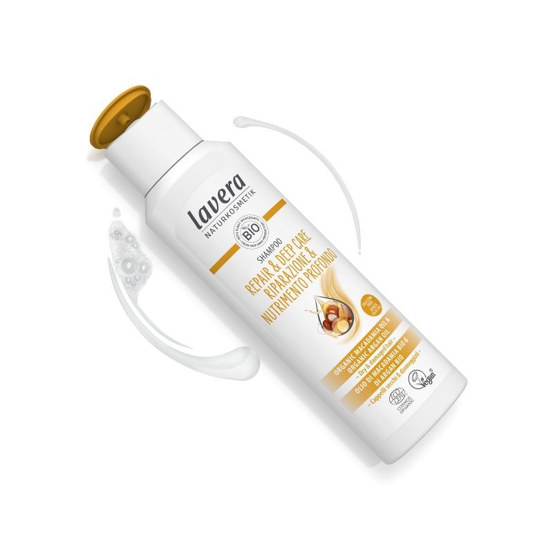 Xampú natural Reparació experta i Cura profunda, un producte de cosmètica capil·lar natural de lavera imprescindible per reparar en profunditat el cabell danyat i sec.