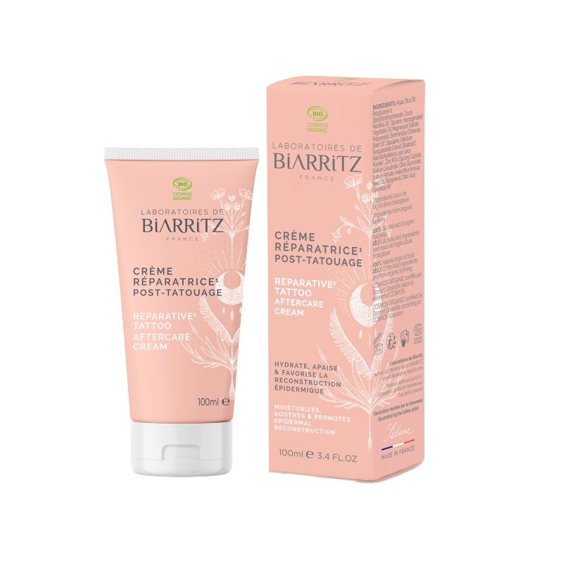 La Crema post tatuatge de regeneració i reparació corporal de Laboratoires de Biarritz hidrata i purifica la zona tatuada, potenciant la reconstrucció de les capes superficials de la pell.