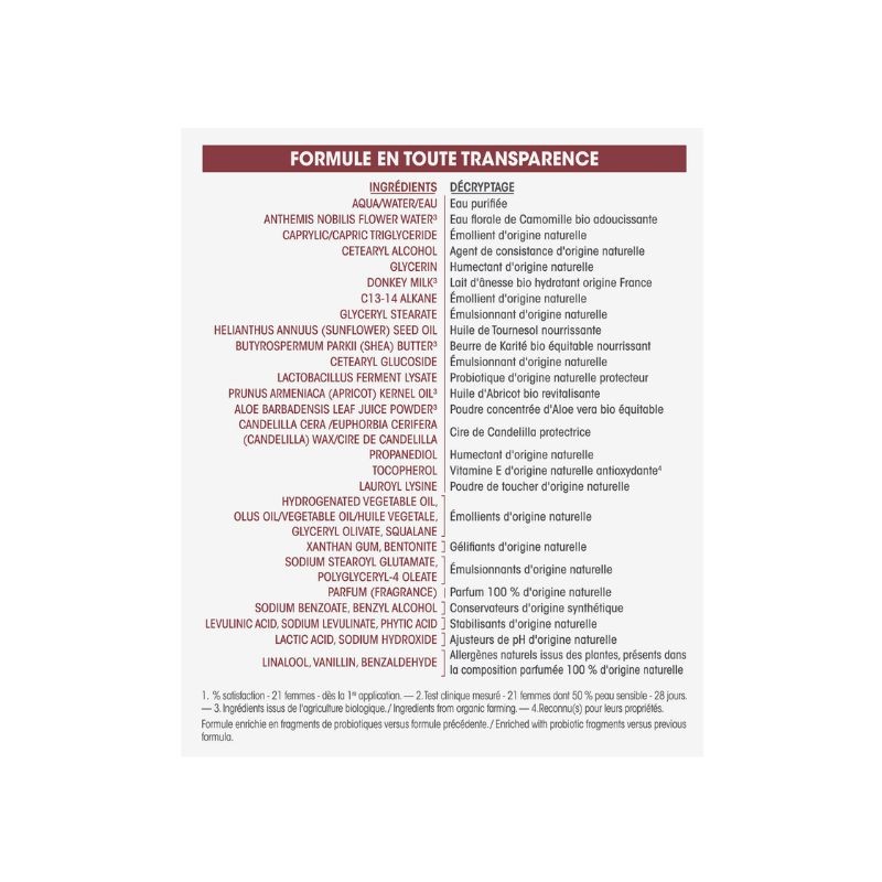 Ingredients de la Crema facial hidratant sedosa llet de burra SO'BiO ètic