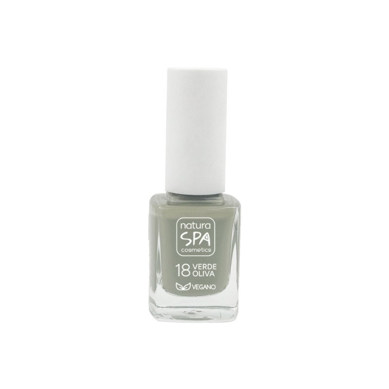 Esmalt ungles 18 verd oliva NaturaSPA Cosmetics. Esmalt d'ungles vegà que cuida i embelleix les ungles. Fàcil d'aplicar, de llarga durada i cobertura alta. 16 colors inspirats en la natura. Gaudeix d'un color radiant i d'assecat en menys d'un minut.